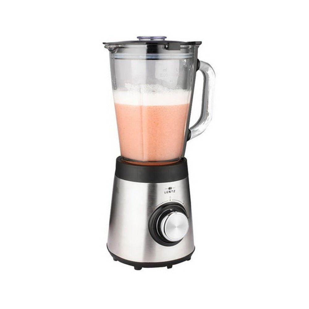 With this powerful universal mixer with 4-way stainless steel knife, you can easily prepare delicious milkshakes, soups, cocktails, crushed ice, smoothies and more. The housing of the mixer is made of stainless steel. The 1,5 liter glass mixing jug has a filling scale. Particularly practical: the lid has a refill opening through which additional ingredients can be added to the glass jug. Description/data: Lentz universal stand mixer 74144 Capacity: 1,5 liters Housing made of stainless steel 1,5l glass blender jug 2 speed levels Ice crush function Pulse function Double safety shutdown 4-way stainless steel knife Lid with closable refill opening fill scale that can be read from the outside Easy cleaning Anti-slip feet Power: 500w Power supply: 220-240V ~ 50-60Hz Color: silver with black applications