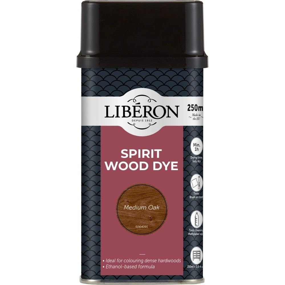 Liberon Spirit Wood Dye is ideal for use on hardwood and furniture restoration, it is a traditional dye which penetrates deep into the wood. It can be mixed together to obtain intermediate shades and can be used for colouring dense hardwoods such as mahogany and oak. It is ideal for colouring previously finished woods i.e. for antique restoration. It is easy to apply, and all colours are intermixable. Coverage: 1 L = 10-12 m². Drying time: Minimum 6 hours. Application: Brush or cloth. Usage: Interior. DO NOT MIX spirit dye with water based dye.