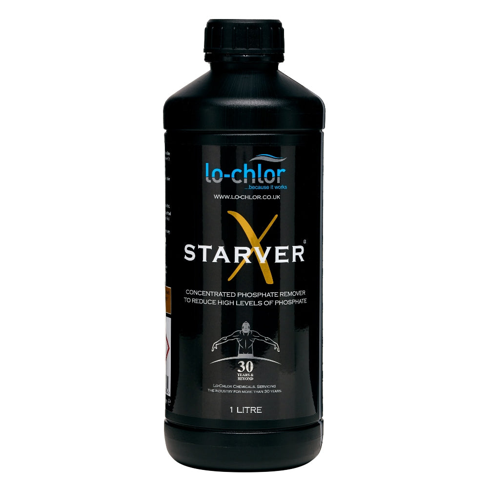 Lo-Chlor Starver X Concentrated Phosphate Remover – Starver® X is a safe and effective superior strength phosphate remover for swimming pools.One litre of Starver® X will remove up to 6000 ppb (6ppm) of phosphates from a 50,000 litre swimming pool. Starver® X is a curative solution designed to remove high phosphate levels.