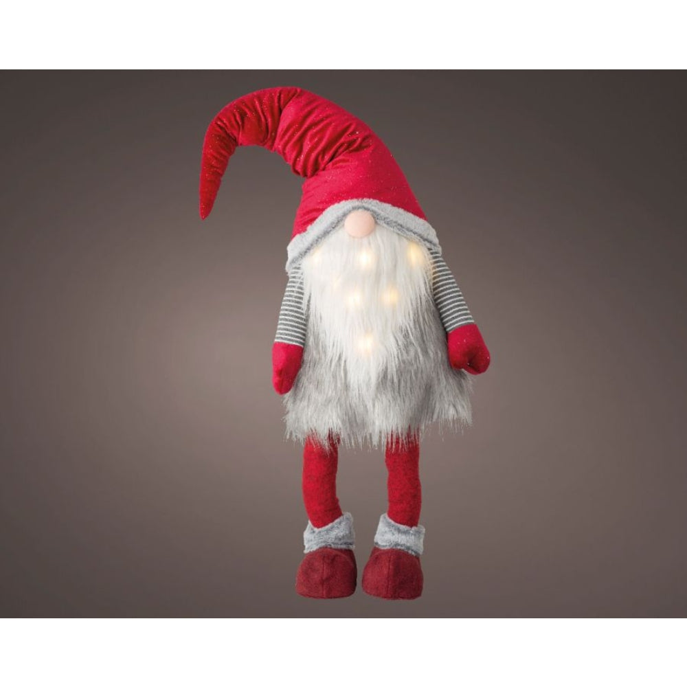 This beautiful gnome with LED lighting is handmade and has a height of no less than 155 centimeters . The gnome is finished with numerous beautiful details and made of polyester . As you can see, the gnome has a large red pointed hat , light gray and white striped sleeves and red shoes. When the 12 LED lights are on, they give warm white light. The LED gnome has a height of 155 centimeters and a diameter of 42 centimeters. Please note, the 155 cm applies when the hat is up. If you bend it, the length becomes approximately 115 cm. This gnome works on 3 AAA batteries (not included). This unique gnome with a friendly appearance will immediately bring a smile to everyone's face. The gnome looks great at the Christmas tree, on a table or just on the floor in your living room or entrance. A real asset for the holidays. Polyester gnome with LED: 155 centimeters high - with extended cap. 12 LED lights. Unique and friendly appearance. Provides warm white light. Made of polyester. Works on 3 AAA batteries. For indoor use.
