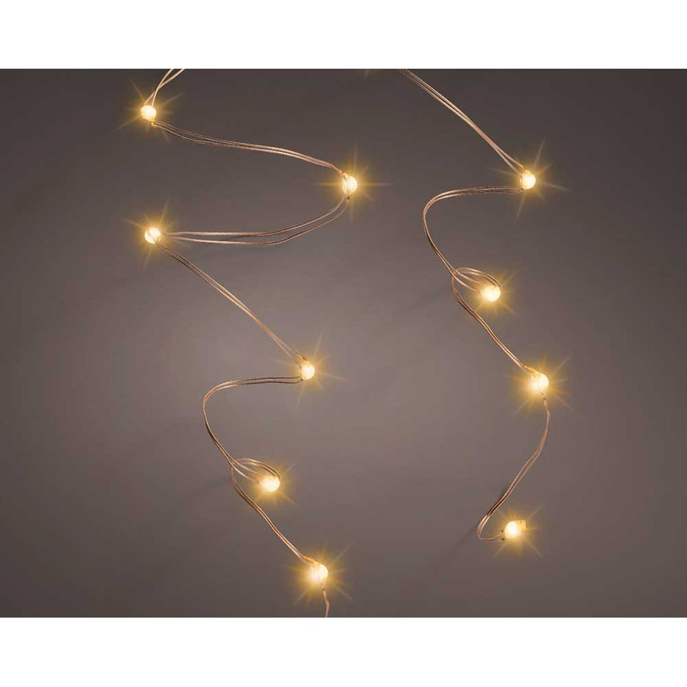 Brighten up your home this Christmas with the Lumineo 20 Micro Wire String Lights in Classic Warm. Each light string starts with a thin and delicate silver wire before 20 warm white, micro LED bulbs are smoothly scattered across. These Lumineo 20 Micro Wire String Lights are battery-operated and require 3 x AA batteries which are not included. There is a built in timer function which means after you activate the lights, they’ll turn on automatically at the same time every day and turn off after 6 hours. No Christmas is complete without lights and this style is great for brightening up smaller areas of your home. Product details Lit length: 95cm Copper wire with classic warm LEDs. Total number of LEDs: 20. Timer function with 6 hours on / 18 hours off. Total cable length: 1.25m. Steady light function. Battery operated. Requires 3 x AA batteries – not included. Suitable for indoor use only. Bulbs are NON replaceable. IP Class: IP-20. Quality mark: CE / UKCA. 5cm bulb spacing. LED size: micro.