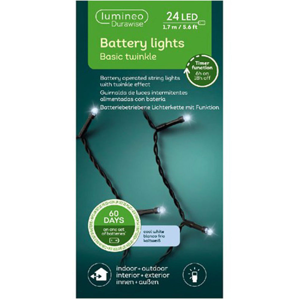 Lumineo Tree Lights Durawise Cool White 172.5 cm These lights are perfect for setting the Christmas mood both indoors and outdoors. Powered by batteries, the Lumineo Tree Lights Durawise Cool White offer a long-lasting glow with their 360 working hours on just three AA batteries. - Made from durable PVC for durability - Total length of 172.5 cm with evenly spaced bulbs every 7.5 cm for optimal light distribution - Equipped with 24 cool white LEDs, each 5mm in size - Comes with a black cable that blends effortlessly with any background - Features an 8-function twinkle effect, adding a touch of magic to your decor Thanks to the built-in timer, these lights automatically illuminate your space for 6 hours each day. Enjoy the convenience and festive charm of plug-free lighting with these energy-efficient, battery-operated lights. Perfect for decorating trees or embellishing outdoor areas, they’ll surely make your home shine this holiday season.
