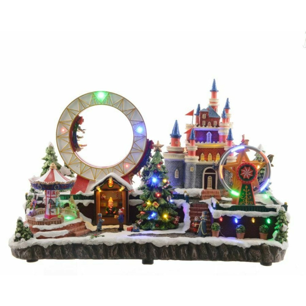 The Lumineo Village Playground Scenery is a charming scene that measures 33 x 25 x 50cm. It features a detailed playground setting with a slide, swings, a sandbox, and other elements that make it look like a real playground. This scene is perfect for adding a whimsical touch to any Christmas village or holiday display. With its realistic details and festive vibes, the Lumineo Village Playground Scenery is sure to be a favorite among both kids and adults alike.