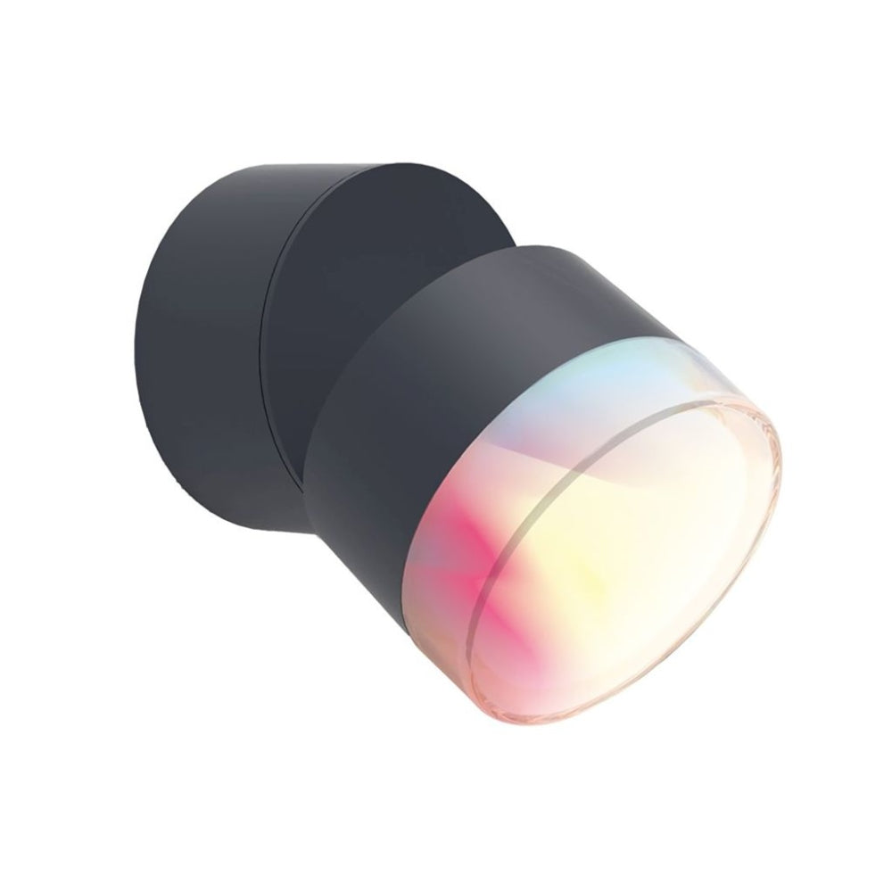 Dropsi outdoor LED wall 1 light Lutec connect dark grey Make your garden an inviting place with this contemporary dropsi wall lamp. The moveable spothead with connected LED module will accentuate your outdoor places. Product dimensions (mm): 94 X 94 X 115 Material fixture: heavy-duty aluminium Ip: ip44 Fitting: LED Maximum Wattage: 9.5w Colour temperature: 2700-6500kandrgb Energetic class: f