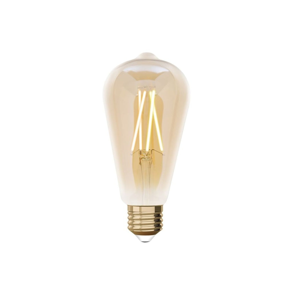 ST64 E27-Bluetooth connected filament bulb-CCT whites(2200-5500K)-amber glass This Lutec Connect decorative LED lamp has a vintage design in edison shape (ST64) with E27 fitting and an 'old-fashioned' filament. The lamp gives a pleasant, soft warm white glow that you can easily adjust with the app on your smartphone or tablet. You can further enhance the decorative effect by combining decorative Lutec lamps in various designs at different heights. This bulb can bring a decorative ambiance to a bright light effect and fit any activity like relaxing or working. Product dimensions (mm): 64*64*140 Material fixture: Glass IP: IP20 Energy class: E Electrical class: Class II Maximum wattage: 7,5w Lumen: 750LM Lumen/Watt: 100LM/W Color temperature kelvin: 2200K to 5500K Ambient operating range: '-10 to 40 Operational warranty: 2 years Life: 20000h Dimmable: Dimmable Via APP and remote control Fitting: LED