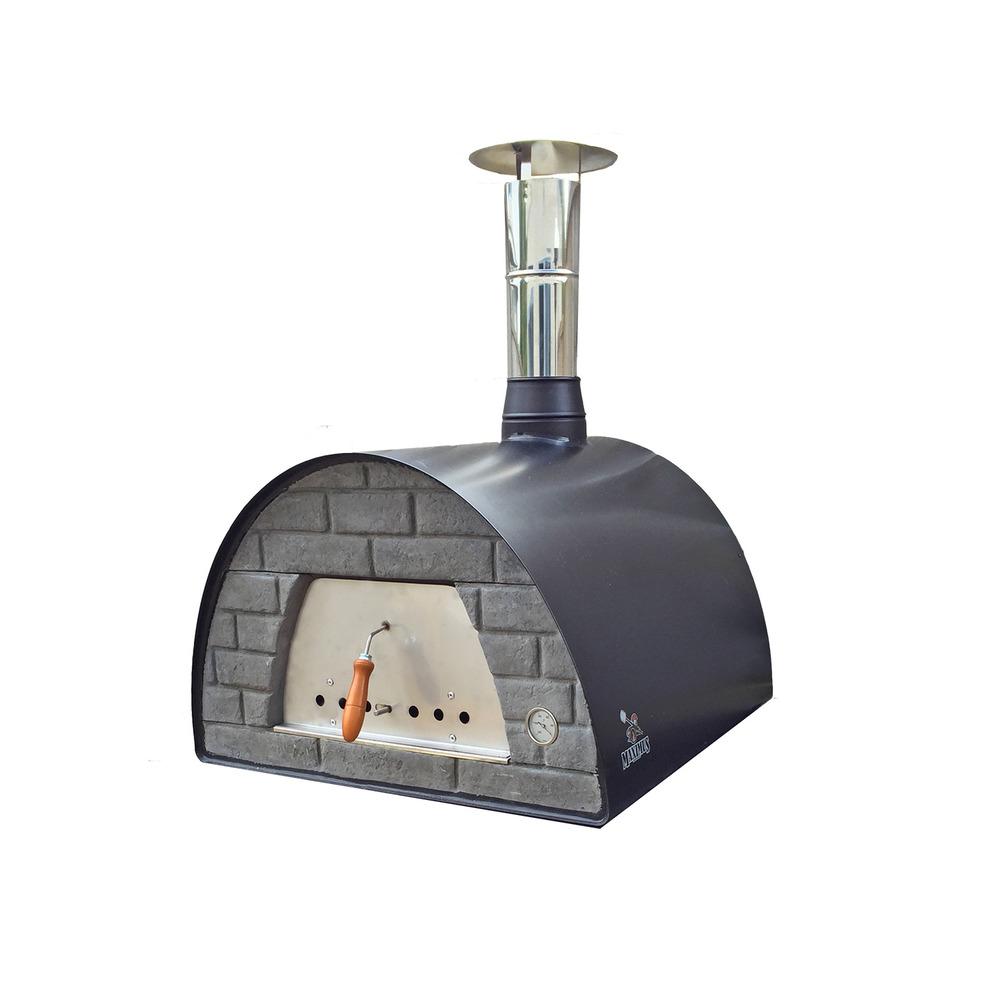 Measurements: Internal dimensions: 90x90 cm External dimensions: 98 cm wide by 99 cm deep Height: 77 cm Door: 50/27.5x28 cm Weight: 135 kg Yield: Up to 150 pizzas/hour (25cm) or 80 pizzas/hour (40cm) Capacity: 5 pizzas Ø 250mm - 3 pizzas Ø 40cm Wood consumption: 4 kg / hour (Eco) Black trolley - 3 year warranty!