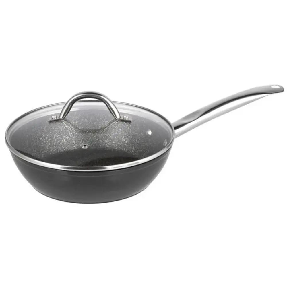 Professional high-sided pan with lid Ø 24cm. Forged aluminum alloy. Energy-saving base. Marbled Whitford Eterna non-stick coating. Heat-resistant outer coating. Heat-resistant stainless steel hollow handle. Safety glass lid. Suitable for all hob types.