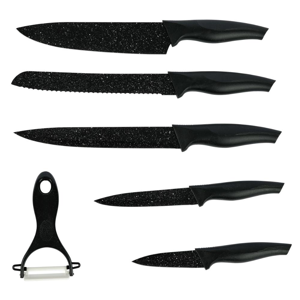"6 Piece knife set with blades made of non-stick coated stainless steel and handles made of plastic. Set includes: -Chef's knife: length 20cm, thickness 1,5mm -Bread knife: length 20cm, thickness 1,5mm -Meas 1,5mm -Utility knife: length 15cm, thickness 1,2mm -Vegetable knife: length 9cm, thickness 1,2mm -Peeler: length 9cm"