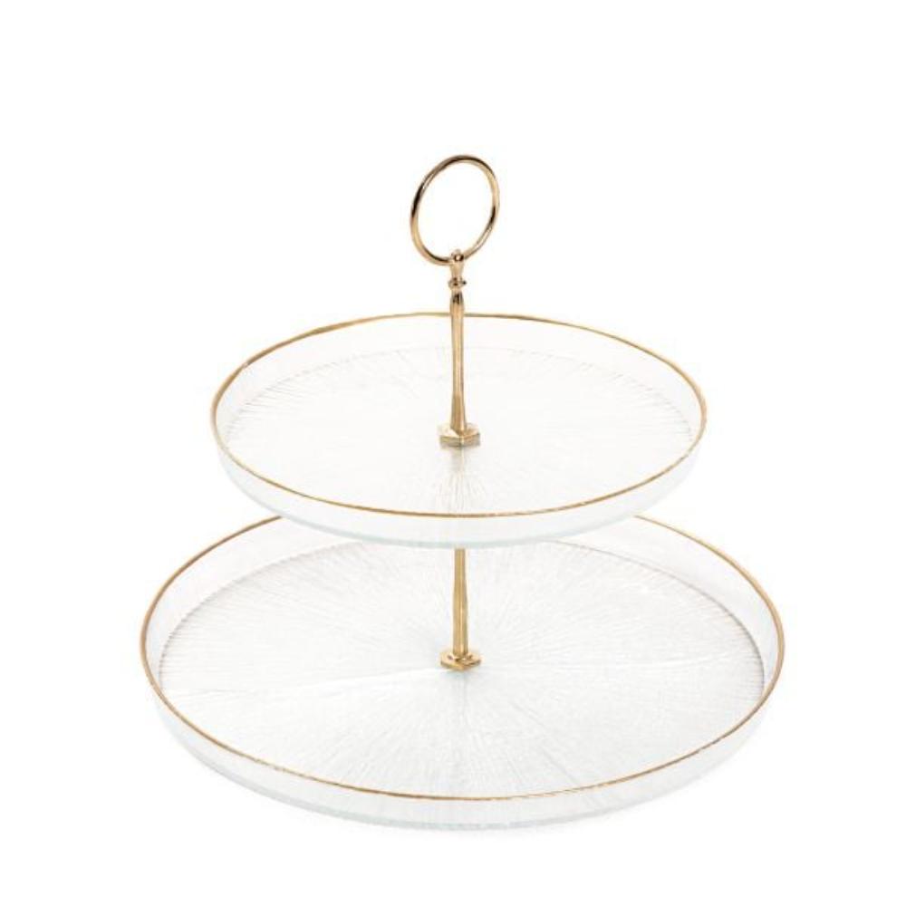 Elegant decorative glass Gold frame Comfortable carrying handle Floor diameters: 21 and 28 cm Tiered platter for snacks, 2 tiers The HOMLA MONZE 2-tier platter will allow you to beautifully display your snacks during a guest visit, as well as on a daily basis. Both tiers are in the same style - the decorative glass is decorated with a gold rim, which is topped by a high rim. The only difference between the tiers is their diameter - the upper tier is 28 cm and the lower tier 21 cm. The platter is distinguished by its exceptional aesthetics, so that it will not only be a functional dish, but also a beautiful addition to the table composition. Purpose The MONZE platter is perfect for serving all kinds of delicacies during parties and celebrations. Cakes, cookies, cupcakes and other sweets will look great on it. It can also be used on a daily basis to display fruit in a way that encourages people to eat it. The frame is finished with a round handle, which makes it easy to carry the platter with its contents. Material The platter's tiers are made of high-quality glass, which is characterised by its durability. The dish should be washed by hand with a soft sponge or cloth.