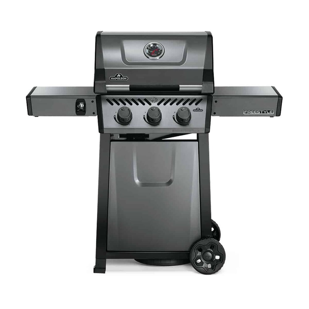 The Freestyle 365 Propane Gas Barbecue is a compact grill with premium features and unbeatable value. Ignited by the instant JETFIRE ignition system that lights the main burners with a jet of flame easily, every time. Get the perfect sear over the cast iron porcelainized enamel cooking grids. Three stainless steel burners provide heat that can be easily controlled by ergonomic knobs and monitored by the onboard temperature gauge. The rugged wheels allow this barbecue to go where the action is, while the easy-to-fold side shelves, featuring tool hangers and a bottle opener, make sure that the Freestyle meets your lifestyle and space. Specifications The Freestyle 365 barbecue grill features 3 main burners and 365 in² of total grilling area, boasting 33,000 BTU’S of grilling power The durable stainless steel tube burner construction provides long life while helping to cook food quickly over even heat Napoleon’s iconic cast iron cooking grids resist rust, provide even heat, prevent food from falling through and create distinctive sear marks The instant JETFIRE Ignition System is innovative and easy to use. It shoots a jet of flame to light each of the main gas burners individually for quick start ups every time Accurately measure the temperature of your grill for optimal temperature control when Barbecuing with the ACCUPROBE temperature gauge Folding side shelves allow this barbecue grill to be tucked out of the way for storage or fit into compact spaces, ideal for balconies, and small patios The enclosed cart design securely holds the propane tank within the cabinet for easy positioning and safe mobility for storage Thanks to the rugged, all-terrain wheels, this grill can easily follow you to wherever the action is The porcelain enameled sear plates help with even heat distribution and protects the burners during cooking WARRANTY: 10 Year Limited* FUEL TYPE: Propane HEAT OUTPUT: 12 kW MAIN COOKING AREA: 51 x 45 (23 burgers) TOTAL COOKING AREA: 3.194 sq.cm HEIGHT: 116 cm (154 cm with lid open) WIDTH: 124 cm (76 cm with shelf/shelves down) DEPTH: 64 cm Comes with gas hose and regulator for 12.7kg Esso or 9kg Sungas lpg tank