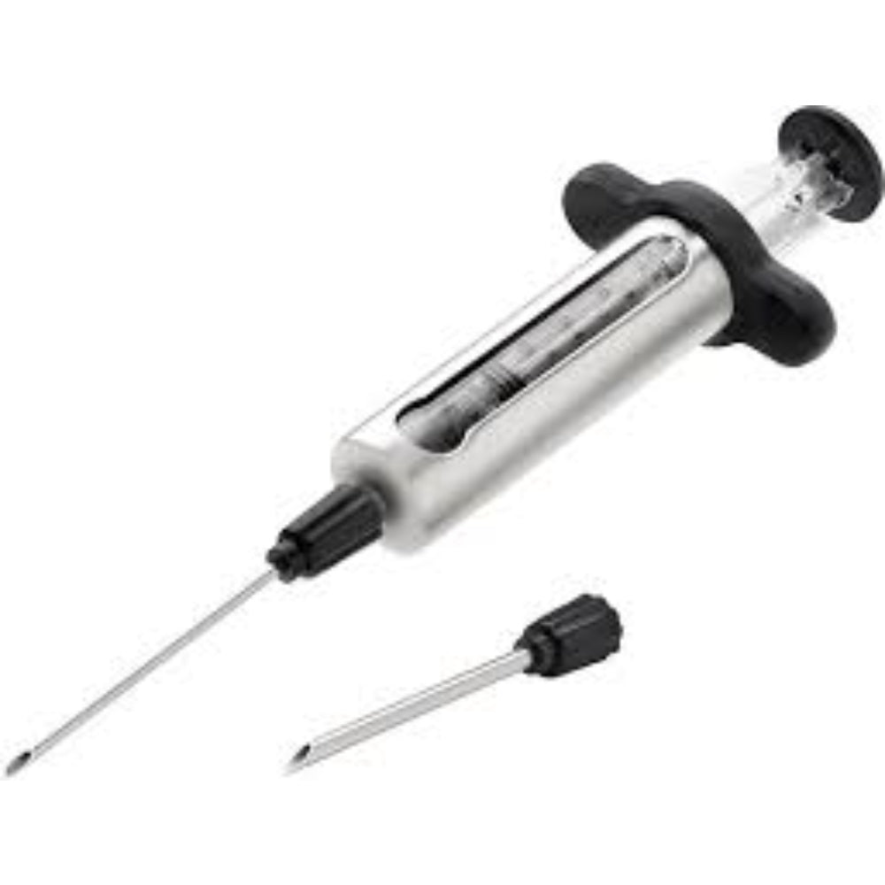 Make your food even more flavourful and prevent dryness with the Napoleon stainless steel marinade injector. The body is made from stainless steel and features a see-thru window with ounce and teaspoon measurements for measuring the perfect portions. There are two interchangeable needles for injecting based on the type of solution you are using. The smaller gauge is perfect for liquid sauces, butter, wine, and thin marinades. The larger gauge needle is perfect for marinades and injections with small solids like garlic and herbs. Maintaining your injector is easy with the included cleaning brushes. Also included, is a fantastic storage case to make sure everything is stored safely and together. Add the stainless steel marinade injector to your accessory arsenal and prepare meals that are juicer and more flavourful than ever.