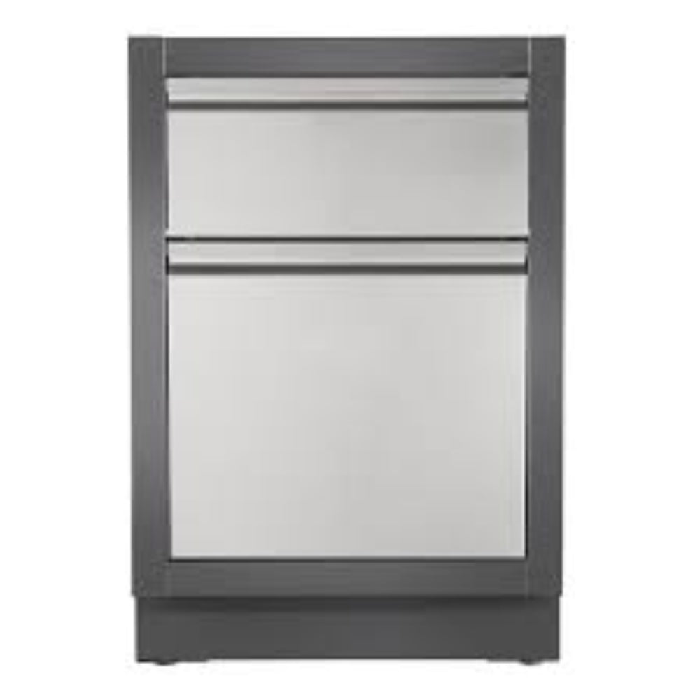 OASIS™ Waste Drawer Cabinet Things can get messy even in the perfect kitchen. Make cleaning up your outdoor kitchen OASIS™ easy with the OASIS™ Waste Drawer Cabinet. Featuring a garbage pull out with a removable waste bin, and a flip down drawer with paper towel holder. This Carbon colored, powder coated, galvanneal cabinet features increased durability from the two-coat pebbling, finishing system and stainless steel door and drawer front. Installation is a breeze with knockouts for gas and electrical. Levelling feet ensure a balanced surface, even if your patio isn't perfectly level. Add this cabinet to the perfect outdoor kitchen OASIS™, along with your choice of grill head and under grill cabinet. *Countertop not included.