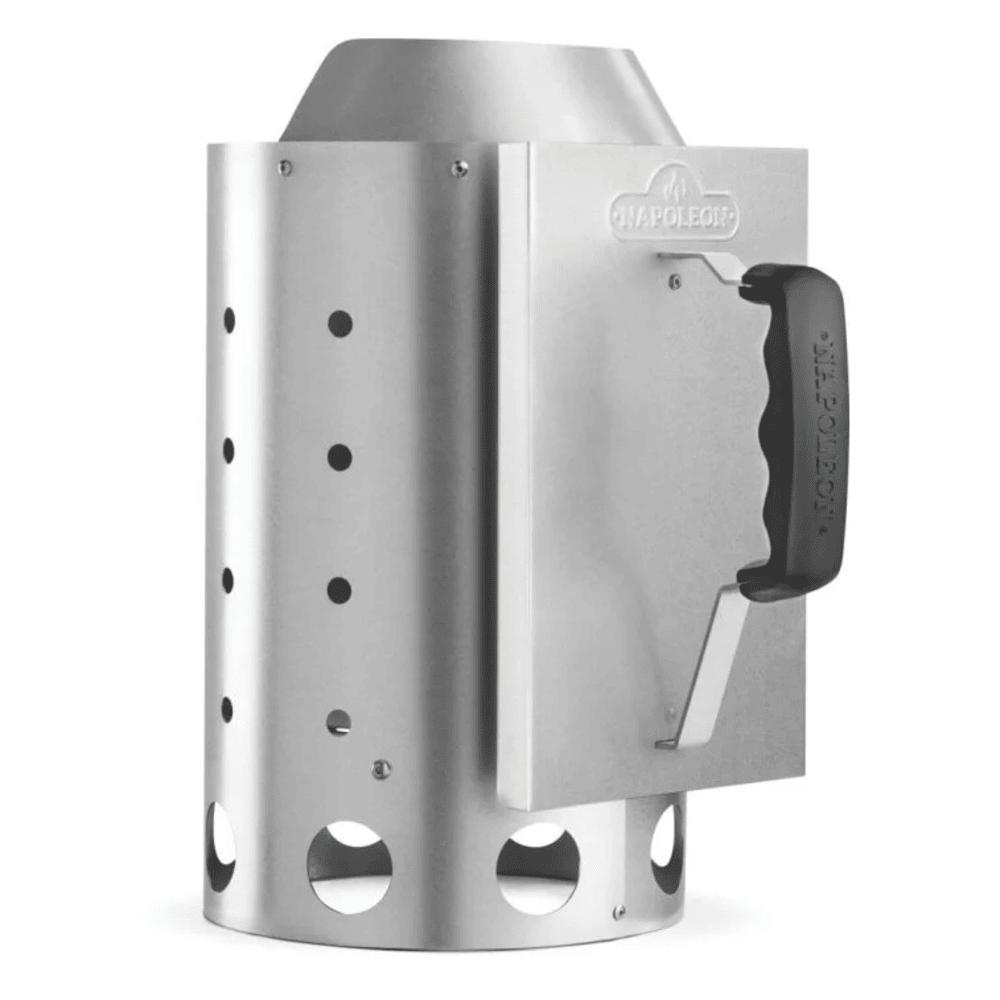 Have charcoal hot and ready to use in minutes, this Charcoal Starter uses a chimney effect that concentrates the heat from your starting fuel to light the charcoal. This Charcoal Starter is constructed from aluminized steel and fitted with a cool-touch handle (although, grill gloves are recommended when hot). This Charcoal Starter holds enough charcoal to fill most charcoal barbecue grills. To use, fill the underside of the Charcoal Starter with loosely crumpled newspaper, empty paper or cardboard egg carton, or paper towel. Turn the Charcoal Starter over and fill the main chamber with as much charcoal as needed for your cook - a few large chunks of hardwood lump charcoal for smoking, up to a full load for some high-heat searing. Once filled, light the paper on fire through the bottom vents of the starter. Allow the paper to burn off, which then ignites the bottom coals. The heat from the bottom coals rises igniting the rest. Using heat-resistant gloves, lift the Charcoal Starter by the handle and pour the lit charcoal into your barbecue grill.
