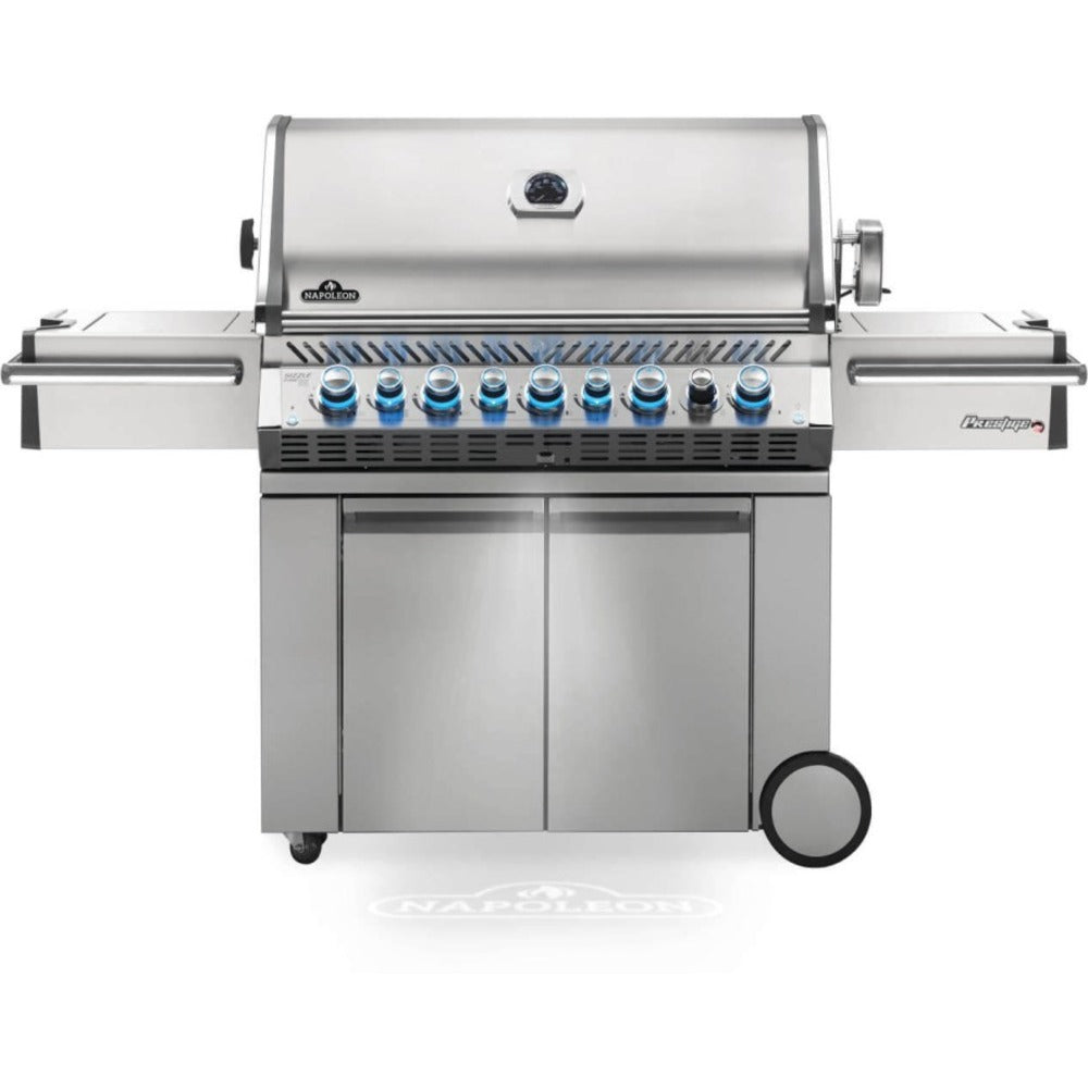 With features you don't see on the most grills, the Napoleon Prestige PRO™ 665 Propane Gas Grill with Infrared Rear and Side Burners has everything needed for professional grade backyard grilling. Superior heat retention provides oven-like performance and first-rate searing; you'll know it's a Napoleon with those iconic WAVE™ cooking grids for those distinctive sear marks and proximity lighting. Use the integrated smoker tray and dedicated burner to add smoke to all of your favorite grilled dishes. On the outside, a shining stainless steel body provides durability against the elements while chrome details add luxury. Not just durable on the outside; under the lid is the same quality stainless steel used for the cooking grids, tube burners and dual-level sear plates. The LED Spectrum NIGHT LIGHT™ Control Knobs have near limitless color options making night-time entertaining a breeze, and they also glow red when the gas is left on as a safety feature. Enjoy evenly cooked restaurant style meals with the rear infrared burner and rotisserie. Key Features The Stainless Steel Prestige PRO665RSIB Gas Grill features 8 burners, 99,000 total BTU's, and 1140 square inches of total grilling area The 9.5 mm thick stainless steel cooking grids are virtually maintenance free and the unique wave shape provides even heating, prevents food from falling through, and produces exceptional sear marks Large side shelves provide prep and staging space, while protecting the infrared sear station. The right side shelf hides an integrated ice bucket and cutting board allowing more prep space while keeping the chef and guests hydrated Ignite the Prestige PRO Gas Barbecue Grill instantly with the battery free ignition. This failsafe ignition system lights burners immediately with a jet of flame Get the perfect, steak house style, sear on steaks using the integrated sear station, infrared heat produces incredibly high temperatures Use the sear station as a gas side burner as well for sauces, side dishes, and frying This grill’s storage cabinet is spacious for all of your favorite BBQ accessories. Interior lights ensure you can find everything easily, while soft close doors prevent slamming and wear and tear on the cabinet doors Dual level, stainless steel sear plates catch and vaporize any food drippings, protecting the stainless steel tube burners from damage and keeps your barbecue cleaner The Prestige PRO665RSIB Propane Gas Barbecue features an infrared rear burner and comes with a commercial grade rotisserie kit for perfect spit roasted meals Change the brightness and knob color of integrated lights, making your grill the life of the party! Set your favorite color or cycle through all of the colors