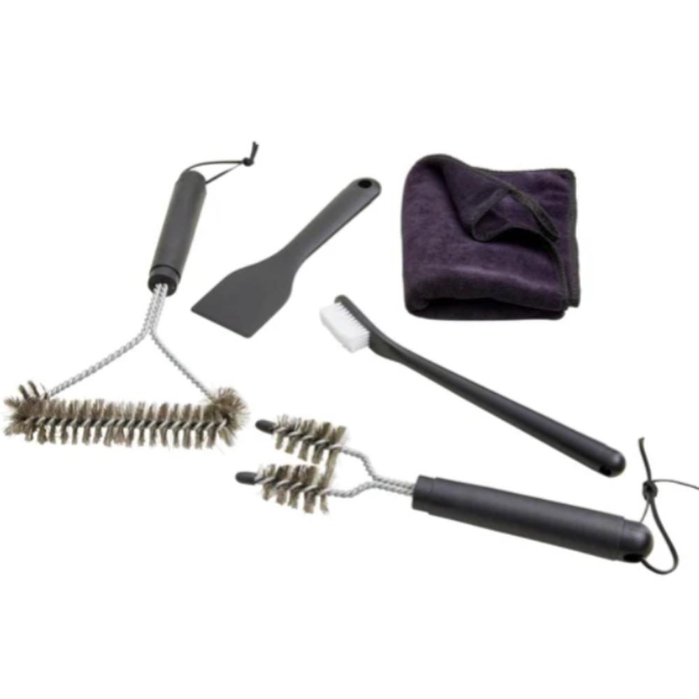 Keep your barbecue in perfect condition with the grill cleaning kit. Cleaning kit including: 2 stainless steel scrapers, 1 brush and a plastic squeegee and 1 micro-fiber cloth. Care Tips For effective and simple cleaning, simply use a damp sponge and a mild soap. The cloth is machine washable.