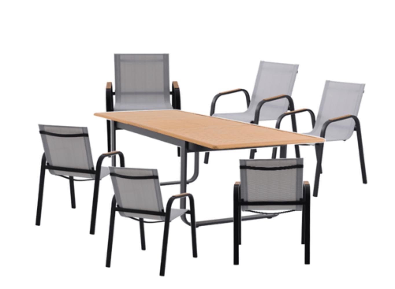 The Naterial Calypso Dining Set with 6 Chairs is designed to bring style, durability, and functionality to your outdoor space. The centerpiece is the extendable Calypso table, crafted mainly from weather-resistant aluminum with a wood-like textured top, creating a modern bi-material aesthetic that blends charm and contemporary design. Its straight lines and beveled angles reflect a designer style, while the dark grey aluminum structure adds a sleek touch. The table comfortably seats 6 guests and features a hidden butterfly extension that, once deployed, can accommodate 2 additional people—perfect for larger gatherings. Lightweight and fitted with adjustable feet, it is easy to move and suitable for uneven floors, with stainless steel fasteners ensuring year-round outdoor durability. Maintaining the table is simple; a damp cloth and neutral cleaner are enough, and a protective cover can be added for winter protection. Complementing the table are the matching Calypso armchairs, which emphasize comfort and style. These stackable chairs feature a textilene seat that contours to the body, wide armrests for added comfort, and a handle on the back to ease movement and hold a scarf or towel. Their industrial-inspired design harmonizes perfectly with the table, creating a cohesive and modern outdoor dining area. The entire set combines practical materials that are easy to maintain and built to withstand everyday use, making it ideal for enjoying meals, planchas, or simply relaxing in any season.