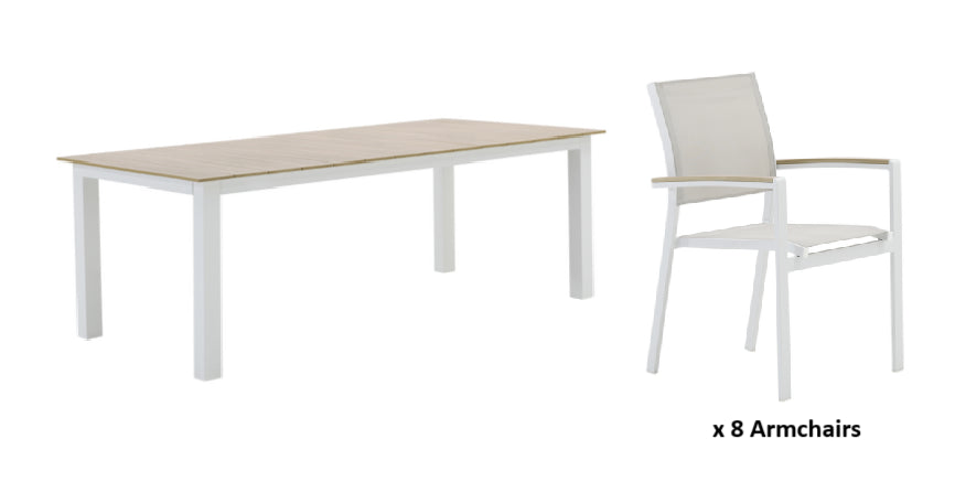 The Clara dining set seduced by its sleek design and practicality. Designed to accommodate up to 8 guests. It is made up of an aluminum stations and a wooden imitation plastic tray. This tray adds a natural charm to the whole, without the maintenance of traditional wood. With its entirely made of aluminum structure, this table is a light, easy to move, and resistant to humidity and rust to accompany you season after season. Combination between naturalness and modernity, the Clara range, with its mixture of anthracite aluminum and wood imitation plastic, offers a warm and trendy charm to your terrace for an industrial rendering. Its geometric shapes amplify its contemporary aspect. For a harmonious dining area, combine this table with chairs in the Clara range, and in the corner garden furniture and the range of the range to extend the meal with a moment of relaxation. Practical on a daily basis, the Clara table and armchiars are easy to maintain. Its wood imitation plastic, with its authentic wood appearance, requires little maintenance. A wet cloth and Marseille soap is enough to restore brightness, as well as its aluminum structure. In winter, remember to protect your table from a breathable cover to preserve it from bad weather. Repairable, spare parts are available to extend the life of your furniture.