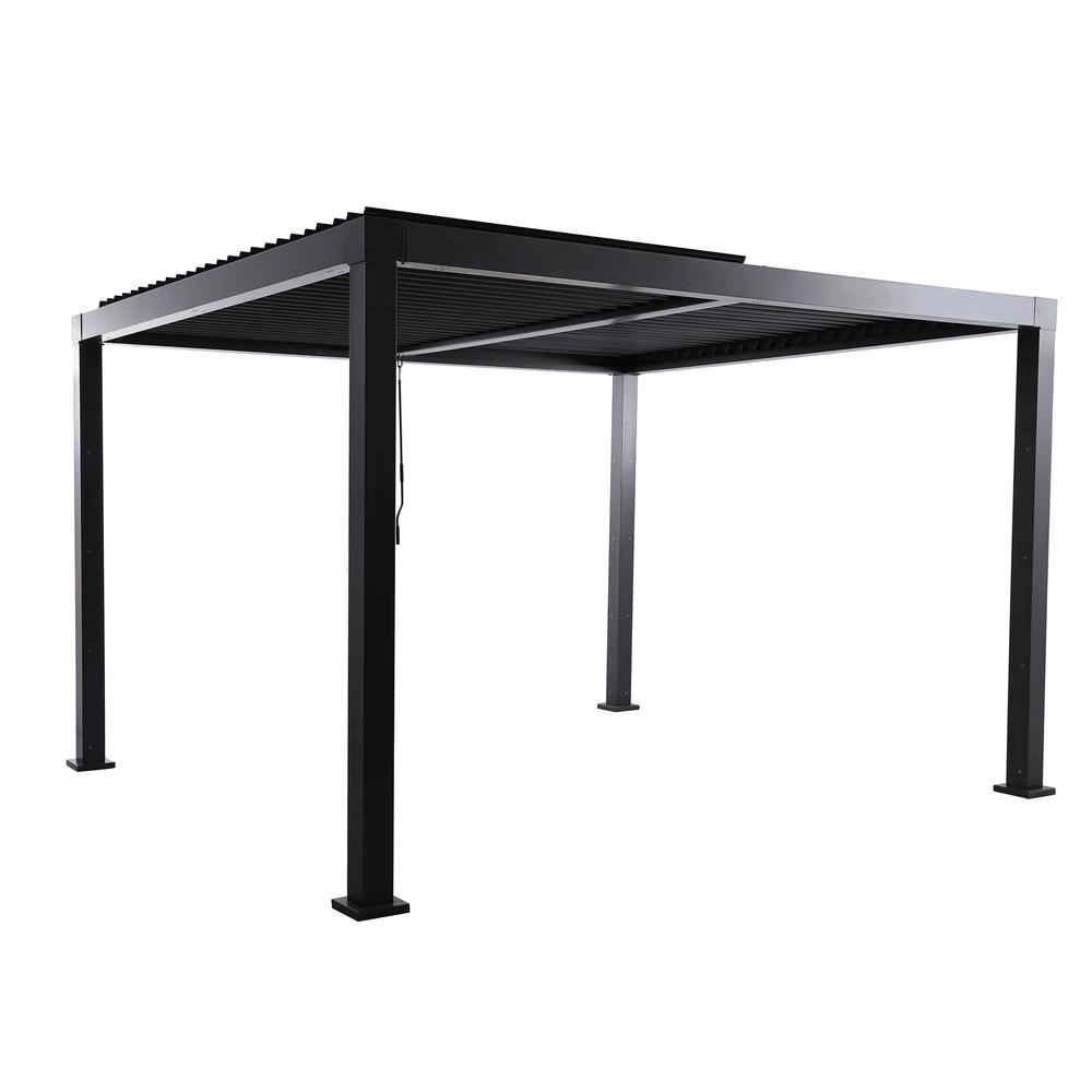 In direct sunlight or in the rain, enjoy your exterior in any situation! Your exterior always operational Live in total harmony with your environment under the Clima bioclimatic pergola. Harness the natural light and warmth of your climate while protecting yourself from rain and wind with this adaptive pergola. Orient its two blocks of blades to bring shade to your patio and interior, reducing heat during your outdoor meals. Its aluminum blades, once tilted, create a light cooling air current under the pergola, letting hot air escape. In case of rain, close the roof of the pergola completely and keep the spirit serene; the pergola is equipped with a drainage system with a flow of water into the feet of the structure. Tilt the blades vertically when you want some light and heat on your patio and in your home. Convenient and easy to combine The contemporary design of the clima bioclimatic pergola brings style to your exterior while allowing you to combine it with most garden lounge whether in terms of materials and shapes (wood, synthetic materials, metals), but also in terms of uses (garden lounge, dining table, outdoor kitchen). With its blinds sold separately, dress your pergola with additional protection against blazing rays or facing eyes. This dark grey colour version will bring out your exterior decoration and allows you to protect a table of 6 to 8 people. Simple installation and maintenance every day Made of high-strength aluminum, the Bioclimatic pergola attaches to the ground with its four feet on the flat surface of your choice in your garden, to withstand the storm and always have a space protected from the elements. Once installed your bioclimatic clima pergola is easily cleaned with soapy water that will bring out its shine. Feel free to use your garden hose to reach the highest areas.