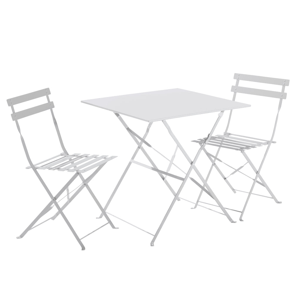 Dining Table: Naterial Flora II Origami for 2 Persons Dimensions: 70 cm x 70 cm Material: Steel frame, powder-coated, zinc-plated steel table top Features: Steel legs with e-coating, galvanized hardware, aluminum plate logo Color: Cream Chair: Naterial Flora II Origami Full Steel x 2 Pieces Dimensions: (W) 41 cm x (D) 47 cm x (H) 80 cm Material: All steel frame, powder-coated with e-coating Features: Steel legs (20 mm x 4 mm), galvanized hardware, silk-printed logo Color: Cream