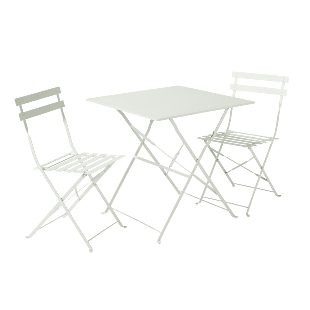 Dining Table: Naterial Flora II Origami for 2 Persons Dimensions: 70 cm x 70 cm Material: Steel frame, powder-coated, zinc-plated steel table top Features: Steel legs with e-coating, galvanized hardware, aluminum plate logo Color: Green Sage Chair: Naterial Flora II Origami Full Steel x 2 Pieces Dimensions: (W) 41 cm x (D) 47 cm x (H) 80 cm Material: All steel frame, powder-coated with e-coating Features: Steel legs (20 mm x 4 mm), galvanized hardware, silk-printed logo Color: Green Sage