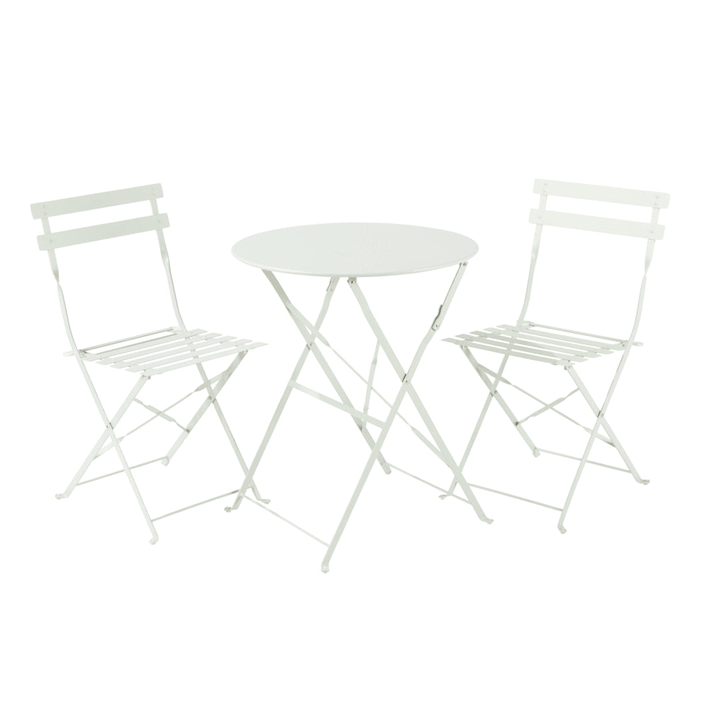 Dining Table: Naterial Flora II Origami for 2 Persons Dimensions: Diam 60 cm Material: Steel frame, powder-coated, zinc-plated steel table top Features: Steel legs with e-coating, galvanized hardware, aluminum plate logo Color: Green Sage Chair: Naterial Flora II Origami Full Steel x 2 Pieces Dimensions: (W) 41 cm x (D) 47 cm x (H) 80 cm Material: All steel frame, powder-coated with e-coating Features: Steel legs (20 mm x 4 mm), galvanized hardware, silk-printed logo Color: Green Sage