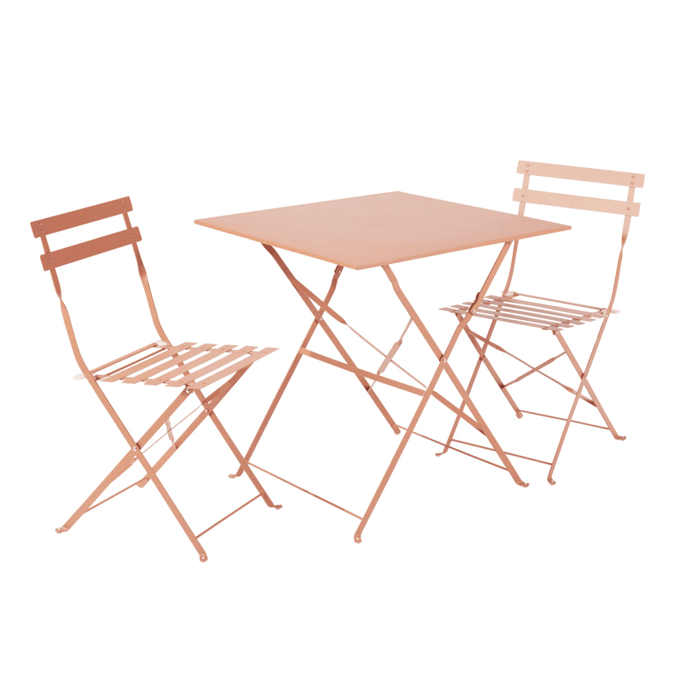 Dining Table: Naterial Flora II Origami for 2 Persons Dimensions: 70 cm x 70 cm Material: Steel frame, powder-coated, zinc-plated steel table top Features: Steel legs with e-coating, galvanized hardware, aluminum plate logo Color: Orange Lava Chair: Naterial Flora II Origami Full Steel x 2 Pieces Dimensions: (W) 41 cm x (D) 47 cm x (H) 80 cm Material: All steel frame, powder-coated with e-coating Features: Steel legs (20 mm x 4 mm), galvanized hardware, silk-printed logo Color: Orange Lava