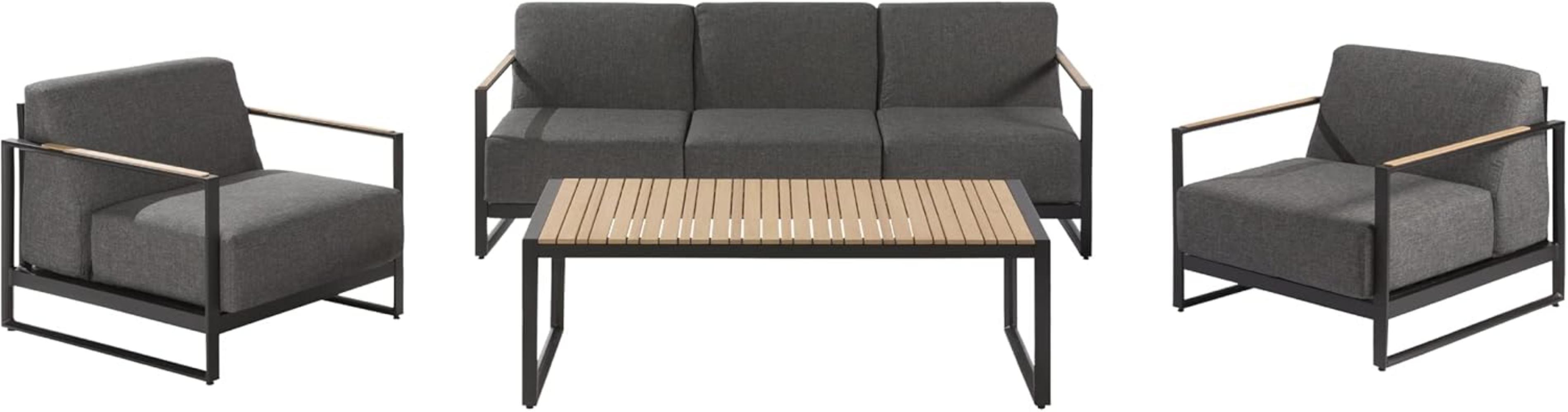 Design: The armrests of the seating furniture and the table top are made of real eucalyptus wood, which comes from environmentally friendly forest management. Its golden colour blends harmoniously with the anthracite grey of the frame, which is made of durable aluminium - a material that is extremely moisture and rust resistant. Comfortable: this garden furniture set consists of 1 sofa, 2 armchairs and 1 coffee table. The foam of the seat cushions hides springs that provide soft and comfortable support, and the frame has slats that offer you a high level of comfort. The table is above average height, so you don't have to strain yourself when you use yourself. Resistant: thanks to its aluminium frame, the sofa, armchair and table of this garden furniture are particularly light, durable and weather-resistant and easy to clean. Eucalyptus is a durable wood species and resistant to weather fluctuations. Care: the eucalyptus wood should be treated with teak or linseed oil 1 to 2 times a year. You can also use a wood grayer. In winter, you should store the furniture under a breathable cover. The cushions are removable and can be washed with the function "cold wash". For the aluminium parts, a damp cloth and a neutral detergent are sufficient. Composition: This Noxia garden furniture set consists of 2 armchairs with the dimensions L. 78.4 x W: 31.25" x H. 26.3", 1 sofa with dimensions L. 197.4 x W. 31.25" x H. 26.3", along with their seat and back cushions with removable covers. Finally, the coffee table measures L. 133 x W: 61 x H 46 cm.