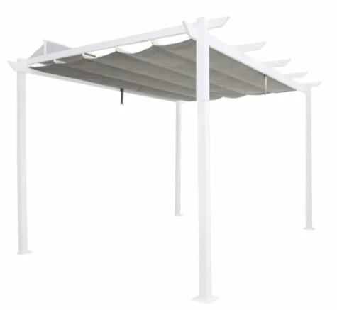 Under the sun, enjoy your terrace sheltered under the Pergola Omega. Its anti-UV treated awning can be adjusted to meet all your needs. Modular protection protect your loved ones from the sun. Designed for permanent installation, its sturdy aluminum structure will not rust and resists humidity. Its rectangular shape allows you to benefit from a large surface to install a table and chairs for 8 guests. The Omega Pergola is modular: the position of its awning adapts to your needs. It is possible to open it entirely, partially, or to close it in case of high sun. Resistant, its thick awning blocks 100% of UV rays and is water repellent: water slides off and is not absorbed by the fabric, thus avoiding any mould. Self-supporting, its installation requires a floor fixing. Clean lines The Omega Pergola easily fits into your outdoor spaces. To ensure a successful association with your space, the white Pergola Omega is available in several colors. For a harmonious ensemble, you can also opt for the table and chairs from the Las Vegas range. Maintenance tips The Omega Pergola awning can be replaced, which greatly extends its life. Its structure can be cleaned quickly with a damp cloth and a neutral product. During the installation of your pergola, be sure to use stainless steel pegs and screws.