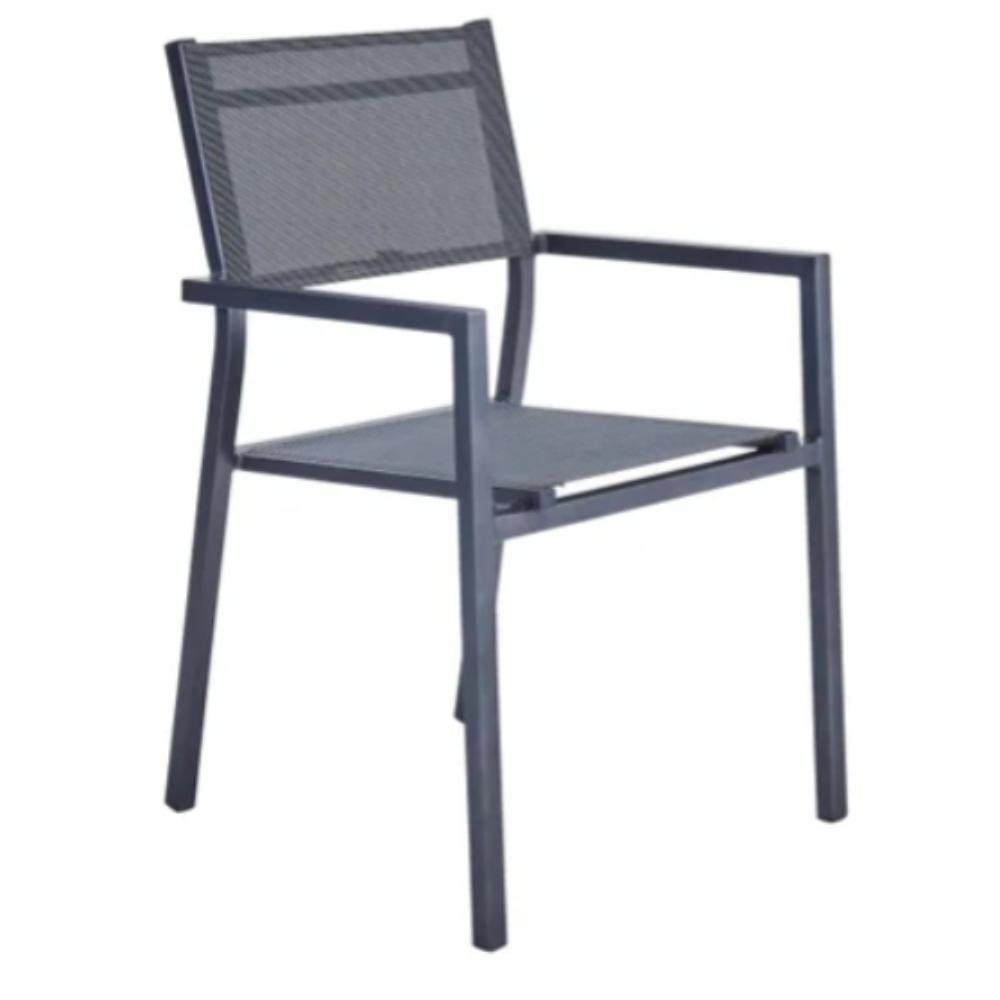 Enjoy the comfort of the Orion Alpha II chair. An ideal midway between sobriety and comfort, it is perfect for spending a convivial moment outside. A permanent comfort Equipped with two armrests, the Orion Alpha II chair provides permanent support while increasing your comfort level. Its backrest supports your upper back while its seat follows the lines of your body thanks to their design in textile, a flexible and robust material. Designed for daily use, the Orion Alpha II chairs are functional and practical. Stackable, it is easy to store and move because it is very light. Its structure, entirely made of aluminum, is resistant to humidity and rust. Modern lines The angular shapes of the Orion Alpha II chair associated with its anthracite color give it a modern style. For a harmonious ensemble, combine it with the Lya II table. Simple maintenance, a damp cloth and a neutral product are enough to clean it.