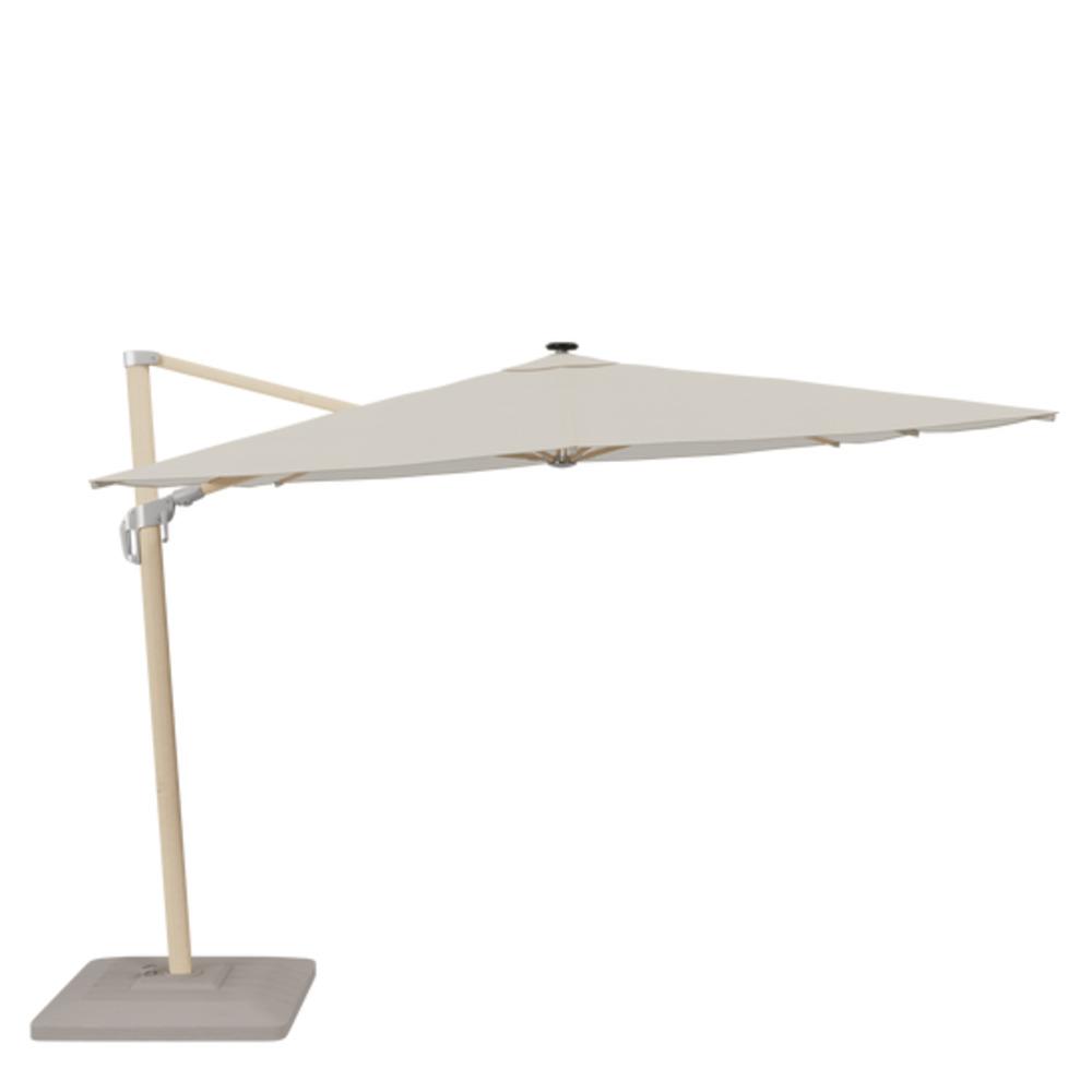 A deported, modern and bright parasol to enjoy your terrace until the end of the night. A functional parasol day With the Parasol Deported Sonora LED, enjoy your meals on the day and night terrace. Its rectangle and thick canvas blocks 98% of UV rays, and can house a large garden furniture, or a table of 6 to 8 people. Its wooden effect aluminum mast ensures solidity and resistance to rust and bad weather. Easy to use, it opens and simply closes thanks to its handle and crank, pivots 360 ° and bows vertically to protect you from the sun at any time of the day. A design and warm style in the evening At nightfall, enjoy a subdued and intimate atmosphere under the parasol thanks to its LED lighting, recharged with solar energy, which allows you to extend your days with friends. The Sonora II parasol, its wooden effect aluminum mast and its white canvas brings a warm appearance to your terrace, with its integrated LEDs on the branches of the structure, which will go perfectly with a plain garden furniture. Using and maintenance advice On a daily basis, the parasol canvas is not likely to discolor because it is in polyester, therefore particularly UV resistant. To extend its lifespan, its canvas can be replaced and adjusted according to your desires! To guarantee optimal stability, be sure to louster the parasol with a weight of 120kg (not supplied). The structure is easily cleaned using a damp cloth and a neutral product. Be sure to winter your parasol under a protective cover to preserve its quality over time. With its modern and functional design, the Parasol Deported Sonora LED is the perfect addition to your terrace, allowing you to enjoy the outdoors day and night in style and comfort.