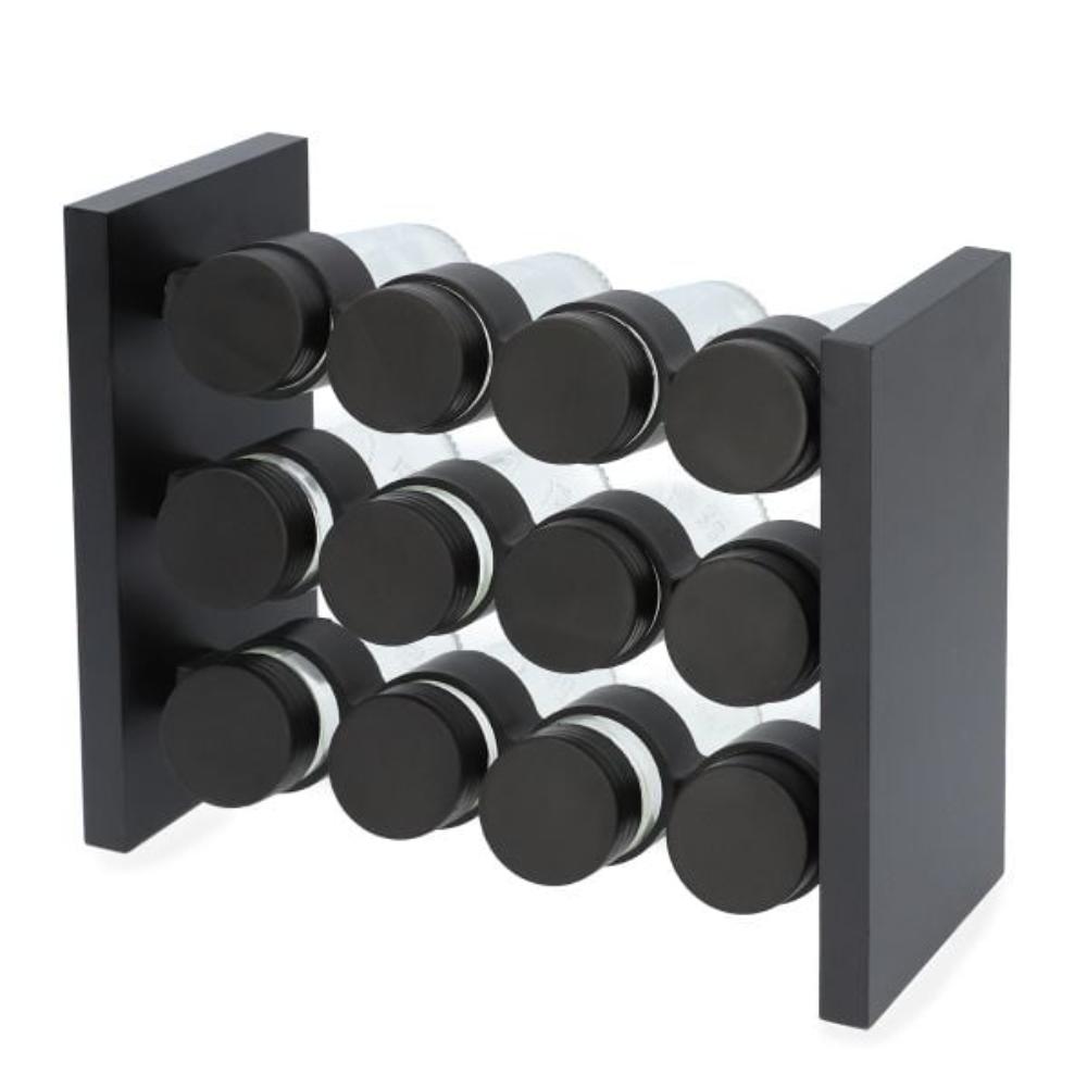 Purpose Is there no product in your kitchen that you can use to store spices? Tired of bags and spices spilling out of them? The OTTO seasoning box is a sensational choice for you! Not only is it a useful product, but it is also highly design-oriented and will add variety to your kitchen décor. Features The product consists of twelve transparent jars with black caps, which are housed in a black stand. The seasoning holder has three rows of spices with four jars in each. In the centre of each spice jar there is a strainer with holes for easy dispensing of spices. Material MDF, glass and plastic were used in the production of the spice box. This combination looks extremely neat and elegant, but is also easy to keep clean. In addition, the glass from which the jars are made does not absorb odours, allowing you to change spices without worrying about the smell!