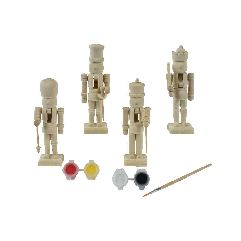 A pinewood nutcracker paint set featuring: 4 Nutcracker, 1 pant brush and 4 coloured paint - yellow, red, white and black.