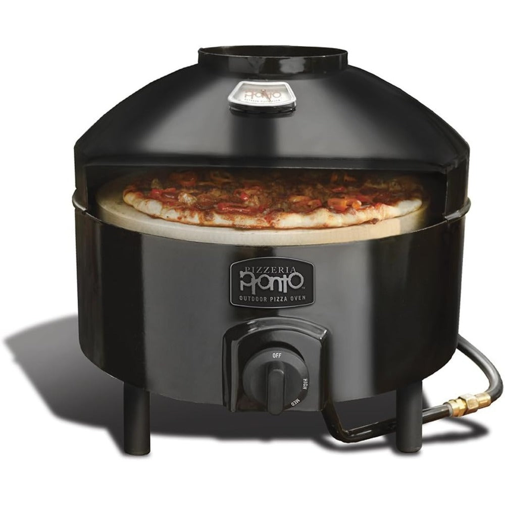 The Pizzeria Pronto is Pizzacraft's deluxe outdoor pizza oven that will change pizza night forever! It's lightweight, portable & safe on any surface. It's incredibly easy to use. Simply hook it up to a propane tank, let it pre-heat for 10 minutes, & you're ready to go. The Pizzeria Pronto reaches cooking temperatures of over 700?F & cooks a pizza in only 5 minutes. This outdoor portable pizza oven is perfect for tailgating, camping, or your regular family pizza night. You will never order delivery again when your Pizzeria Pronto makes homemade pizza fast, easy & delicious! Dimensions: 18.6 x 18 x 15.5 cm