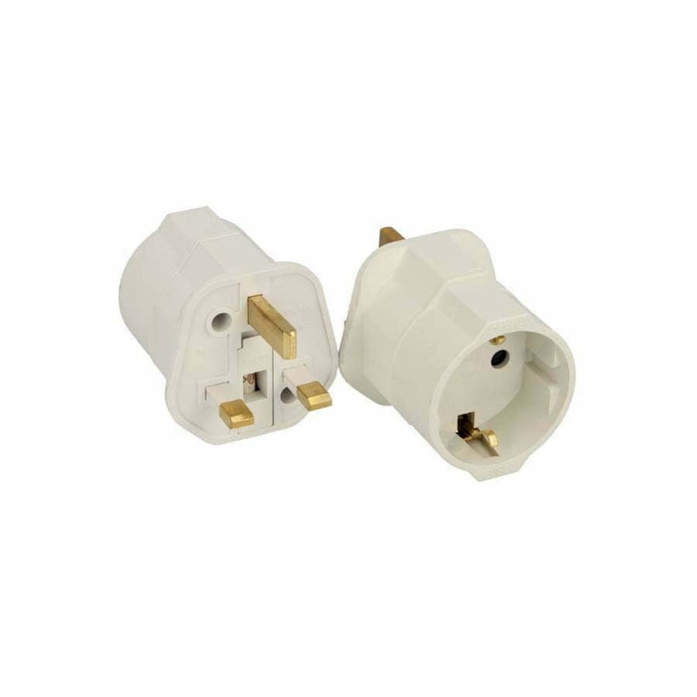 Adapter to convert Schuko plugs to 3 Pin British Standard plugs.