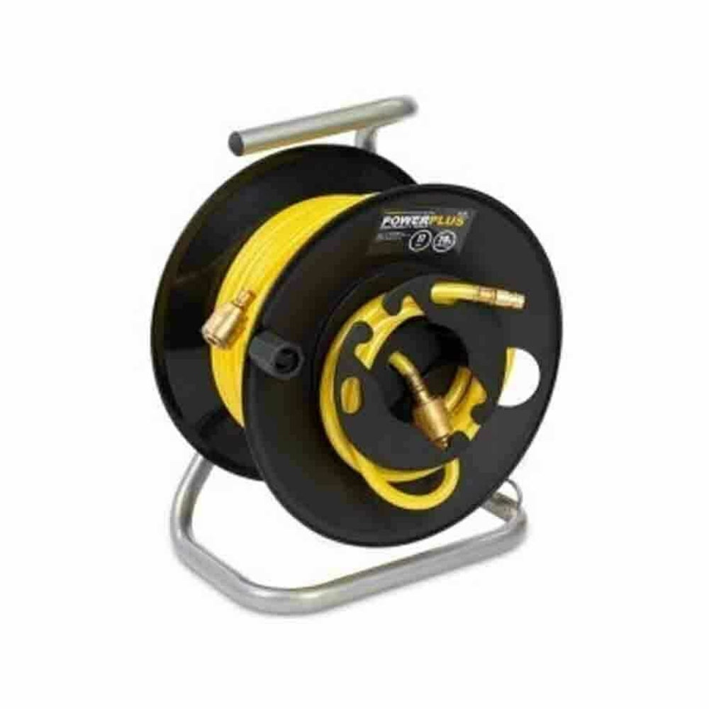 This portable air hose reel is equipped with a 20 meter long PVC air hose. The compressed air hose is cross-braided, making it both very sturdy and flexible. You simply wind the hose back onto the reel. This PVC compressed air hose from Powerplus is 20 meters long and coiled on a reel. The air hose is equipped with quick couplings. The air hose reel is suitable for compressors with a maximum pressure of 17 bar. Dimensions: L: 36.2 CM, W: 29.8 CM, H: 22.8 CM. Weight: 3.37 KG.