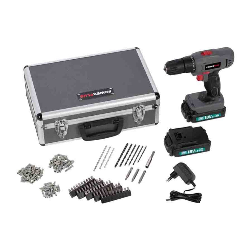 This kit includes an 18V drill/screwdriver, two 1300mAh One Fits All lithium ion batteries and a 153-piece range of drill bits, brackets and plugs. Comes in a strong metal case with a convenient carrying handle. Features: Plenty of accessories are included in the package 153 pcs, Aluminum carrying case, 2 speeds, LED work light, Quick-fitting chuck, Reversing switch, Soft handle. Technical information: Voltage: 18 V, Battery capacity: 1300 mAh Li-ion, Rotation speed: 0-400/0-1500 rpm, Torque setting: 20 + 1, Maximum Tightening torque: 35 Nm, Chuck: 10mm, Battery charging time 1 hour. Weight 1.3kg