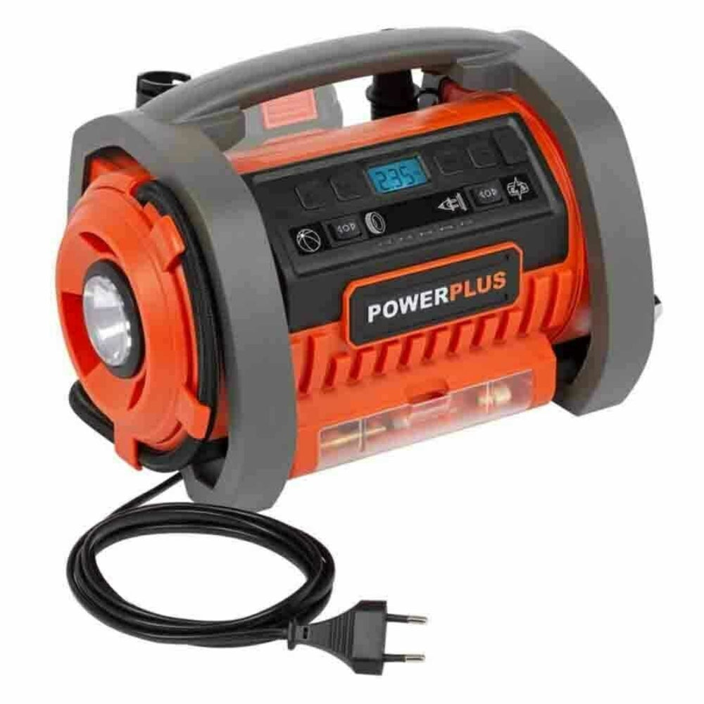 Powerplus air compressor 20V + 220V is excellently suitable for e.g. filling and emptying swimming pools and filling balls and car tires. The device is compact in size and easy to carry, and it runs on battery or mains power. You can also charge your phone with a USB connection. The device has a digital pressure gauge with e.g. automatic stop and correct pressure display (Maximum 11 bar), LED work light and three adapters for which the device has a built-in storage space