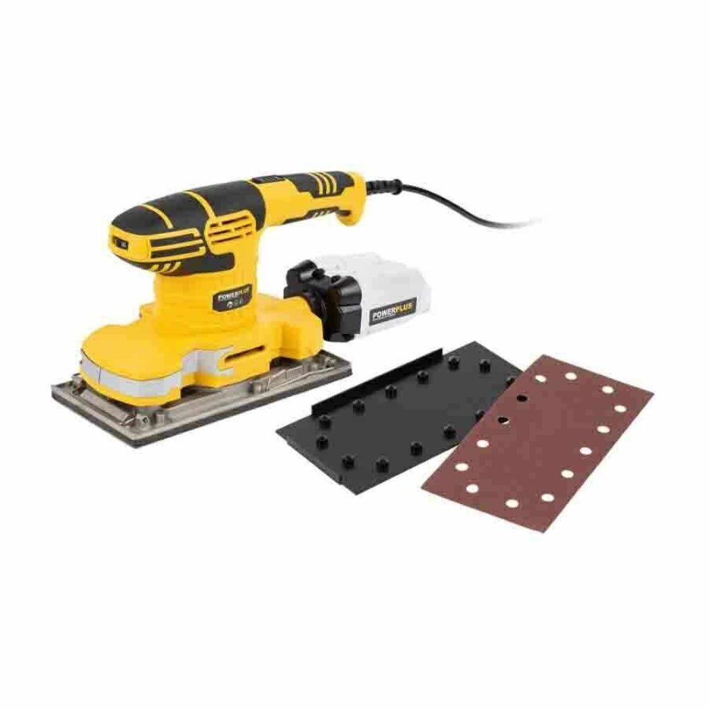 With this 330W orbital sander from Powerplus you can easily sand large, straight surfaces, such as doors and tables. The large sanding pad of 115 by 230 mm is perfect for this. The Velcro system also ensures a quick change between your rectangular sandpaper. This is also easy thanks to the quick clamping system. You can choose the desired speed between 12,000 and 22,000 min-1 via the speed controller. The sanding dust is discharged through the dust collector, so that you maintain a clear view of the sanding surface.