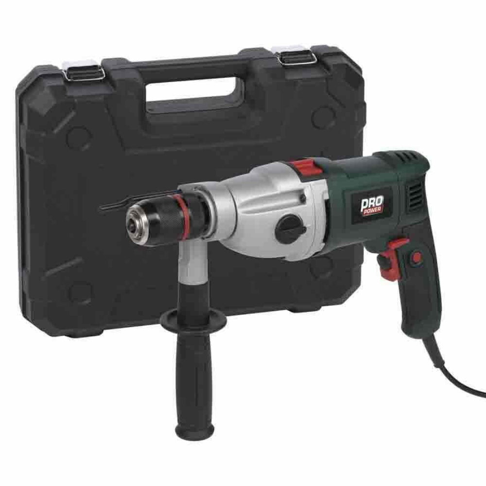 This 1050 W impact drill drills holes up to 16mm in concrete, 16mm in steel, and 40mm in wood. The 13mm keyless Peacock chuck has a locking function that makes changing drills and bits easy. _x000D_ The machine is also equipped with a metal ransmission, metal depth stop, left/right function and a lock button in the on position for continuous use. _x000D_ You choose from 2 speeds that you can set by the speed control from 0 to 1100 min-1 and from 0 to 3000 min-1 for an optimal drilling s_x000D_ When you choose the impact drill function, you can count on a stroke frequency of up to 4500 strokes per minute