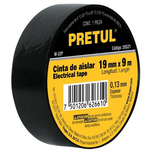 Specifications: Length 9 m, Width 19 mm, Thickness 0.13 mm. Voltage resistance: 4500 V. Breaking strength: 4 Kgf. Maximum temperature: 80 °C E Features: Made of PVC with a high-anchor acrylic adhesive base. Flame retardant and inhibits corrosion of electrical conductors. Uses: Electrical insulation in wires and cables with nominal capacity up to 500V.