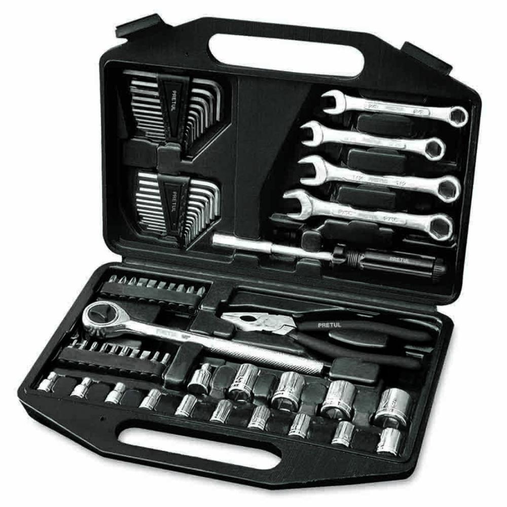 Includes: 10 Dice 3/16" To 7/16", 1/4". 4 X Dice 1/2" To 11/16", 3/8". 1 Ratchet, 3/8". 1 Screwdriver, 1/4". 3 X Phillips Tips Ph1 To Ph3. 2 X Hexagon Tips 3 And 4 Mm. 3 X Pozidriv Tips Pz1 To Pz3. 6 X Torx Tips T10 To T30. 2 X Flat Tips 3/16" And 7/32". 4 X Flat Tips 4 To 7 Mm. 4 X Combination Wrenches 3/8" To 9/16". 1 Electrician'S Clamp 6". 12 X Allen Keys 0.9 To 6 Mm. 12 X Allen Keys 0.0036" To 3/16". 2 X Tip Organizers. 2 X Allen Key Organizers. 1 3/8" X 1/4" Adapter.