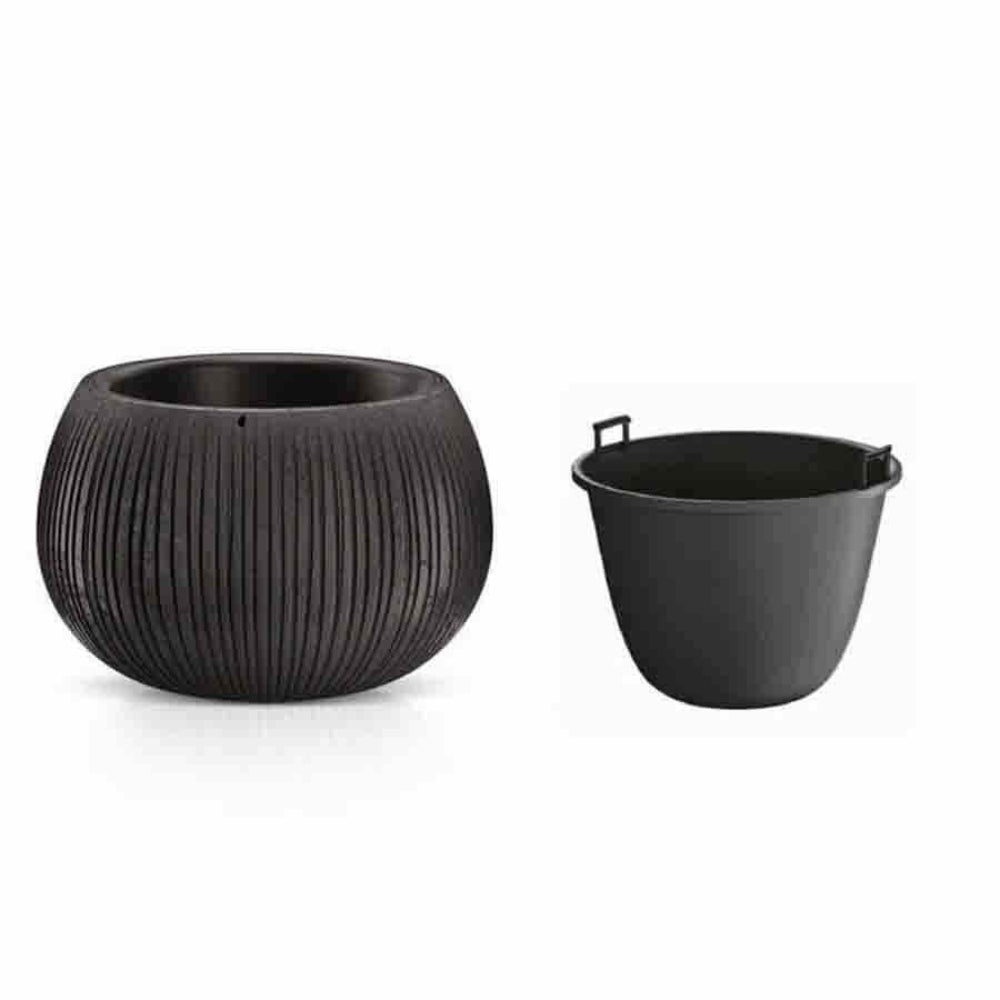 Two-piece planter (planter and inner tank for soil or gravel), from the BETON BOWL collection in new dimensions. It gives so much play that one that you don't use as a planter, offers you a decorative coffee table. Soft to the touch, the Beton Bowl rounded planters are inspired by cement, offering a rounded appearance with a design that gives it a feeling of lightness, and that makes the plants stand out. Great for indoor décor, but also suitable for outdoor placement. Perfect for living rooms, terraces, conservatories or patios, made of high-quality plastic. 2-in-1 set: Planter that includes an adapted inner tank that reduces the amount of soil needed. The pot has a total capacity of 1.4 litres, while the reservoir requires 1.4 litres of soil. Dimensions: 13.6 (height) x 18 (width) x 18 (depth) cms Black cement color.