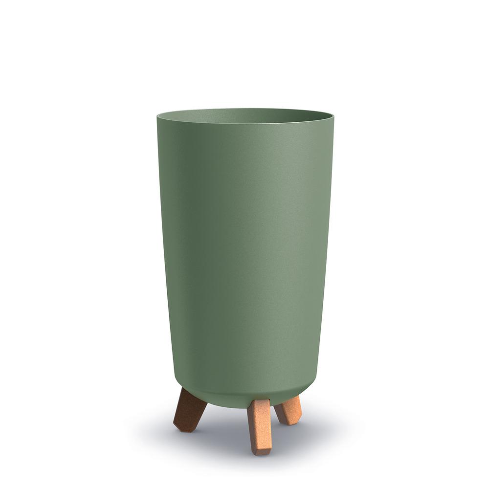 Tall planter that by wooden looking legs elevates flowers and plants for greater eye-catching effect in modern interiors, balcony and garden scapes.
