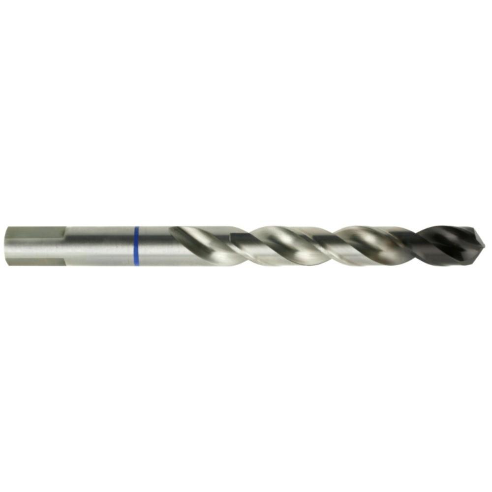 Precision drill for drilling steel up to 1000 N/mm² and cast steel (alloyed and non-alloyed), grey cast iron, malleable cast iron, spheroidal cast iron, sintered iron, nickel silver and graphite. Advantages: 118° EVO blade with cross-ground section. Drilling with pin-point accuracy - no centre punch; dimensional accuracy - precise drill holes; low feed and cutting forces - energy-saving operation. Blue ring - for steel Simple material assignment - no confusion; suitable for machine taps and countersinks. TiAlN head coating Maximum service life - no built-up edges, greater surface hardness, improved thermal stability, dry machining possible; "NUR" coating on the area subjected to the greatest load - greater flexibility and more cost-effective. TRICON shaft, positive-fit transmission of forces No movement in the drill chuck - optimal power transfer/no groove formation; no excessively deep clamping in the drill chuck - optimal elasticity; low energy expenditure when opening and closing the drill chuck - protects the drill chuck.
