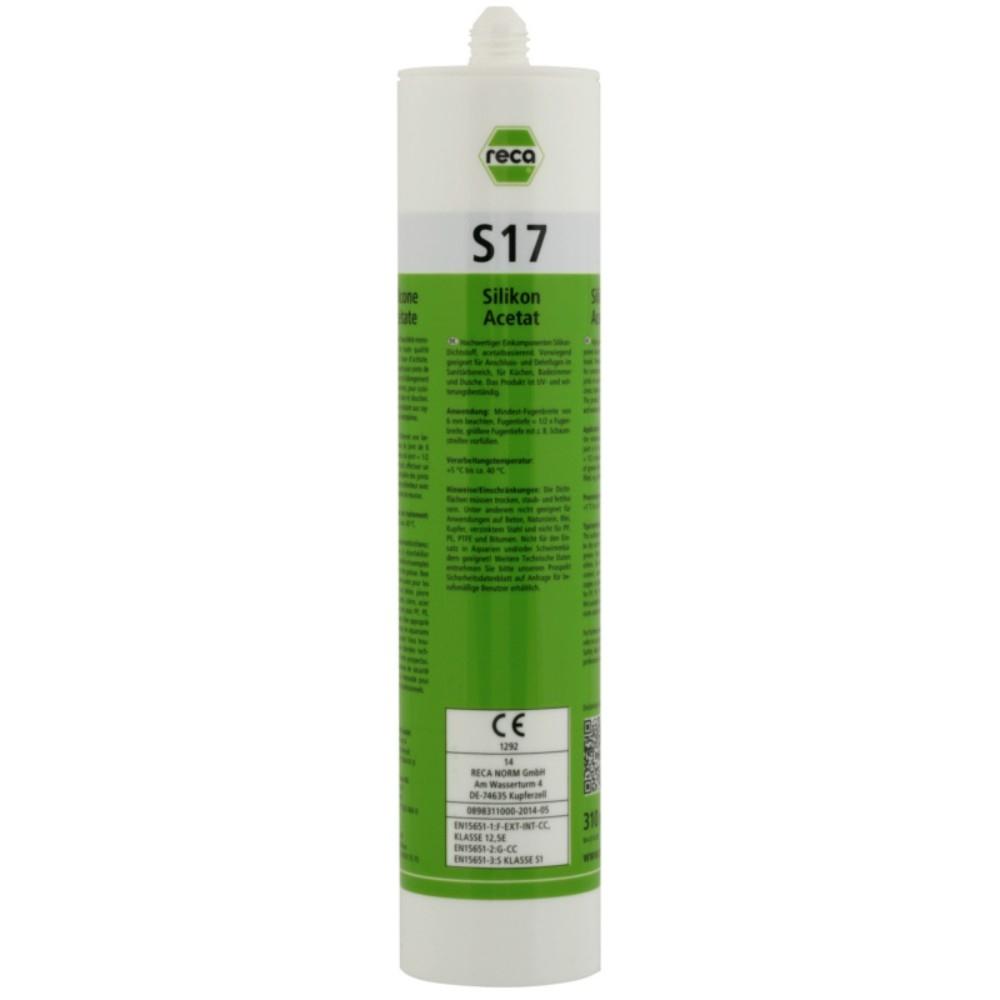Field of Application: For kitchens, bathrooms and showers. Connection joints for washbasins, bathtubs and shower trays. Advice: Not suitable for e.g. underwater joints or for contact with bitumen. Risk of corrosion when used on bare iron and non-ferrous metals. Not suitable for compressed air guns. Application temperature: +5°C to +40°C Temperature resistance after curing: -30°C to 150°C Advantages: As a general rule, S17 adheres even without the use of primer, and delivers outstanding results on a number of substrates in the construction environment such as glass, glazed surfaces, enamel, porcelain, epoxy, polyester, hard PVC, stainless steel, anodised aluminium and painted wood. Prevents mould. UV and weathering-resistant.