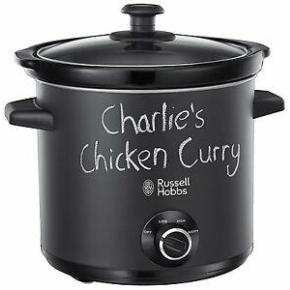Prepare Foods: With More Than Enough Space To Cook For Up To Four People, The 3.5 Litre Russell Hobbs Chalk Board Slow Cooker Is Ideal For A Family Kitchen. It'S Also Incredibly Convenient As Everything Cooks In One Pot ? So No Hassle Of Using Multiple Pots And Pans. If You Don'T Have Time To Prepare Meals After A Busy Day At Work, Just Make The Preparations Earlier, Set The Timer For When You Want To Eat And The Cooker Will Do The Rest Right On Time. Make Food Tastier: The Russell Hobbs Chalk Board Is Great For Making Meals Tastier And More Nutritious. Slow Cooking Not Only Retains Nutrients And Vitamins In Your Food, It Also Preserves Flavour And Tenderises Tougher Meats. As The Cooker Uses Only A Small Amount Of Energy You Can Save Money On Your Bills Too. With Three Heat Settings, A Glass Lid For Viewing Your Cooking And Cool Touch Handles For Safety, The Chalk Board Is A Great Addition To Your Kitchen. Make Notes: The Cooker'S Matte Black Powder Body Can Be Written On With Chalk - Jot Down Ingredients, Cooking Times Or Jolly Messages To Add A Bit Of Fun In The Kitchen. Features: Type: Slow Cooker, Ideal For Cooking: Ideal For Cooking 4 Portions Of Food, Food Capacity: 3.5L, Number Of Functions: 3 Heat Settings - High, Low, Keep Warm, Keep Warm Function, Bowl Type: Ceramic, Glass Lid, Wattage: 1000-1200W, Dishwasher Safe Parts: Ceramic Pot, Additional Accessories Included In The Box: 2 X Chalk, Approx Dimensions: 27Cm X 27Cm X 27Cm