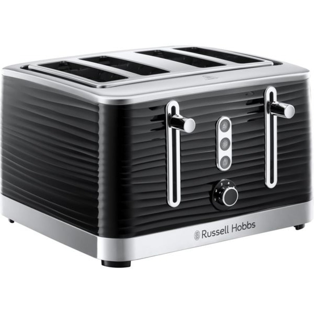 Product Description: Make a stunning statement on your kitchen counter with the Inspire 4 Slice Black Toaster. Combining a classic, clean black with a strong stainless steel, this toaster adds a touch of class to any kitchen. Be drawn in by its unique design of entrancing, textured ripples that endlessly wrap around every aspect. With 4 large slots it’s the perfect size to bond over breakfast with those that matter most. So switch off from the world, push down the lever and get back to truly enjoying life with a delicious breakfast and great company. Product Specifications: Defrist function, Reheat function and High-lift eject