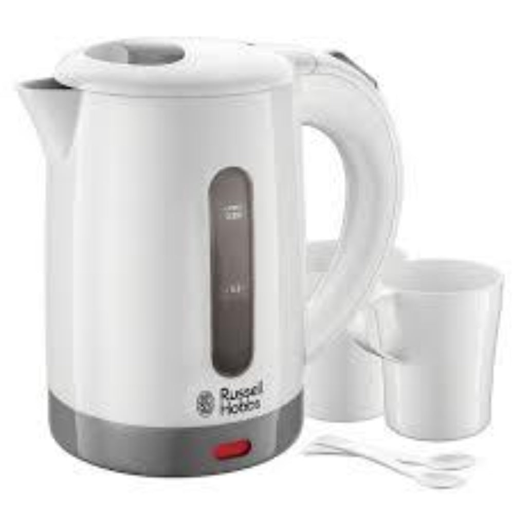 Russell Hobbs 850ml Travel Kettle with 2 Cups + Spoons Small and lightweight - the travel compact kettle is the perfect size for cramming it into an already busy backpack or case. Include two cups and spoons so you have all the essentials to make a good brew. Universal voltage - designed to travel with you wherever you go in the world 850ml capacity - the perfect size for pouring a cuppa for two people With dual water level windows you can easily check on just how much water you're boiling