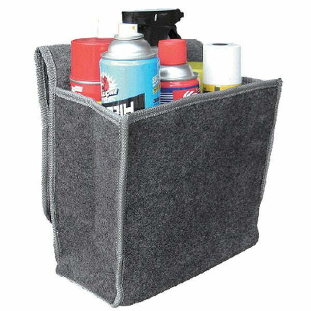 Stylish grey carpet bag with a contrasting lighter grey binding. Ideal for storing items in your car. Features a handy flip top closing secured with hook and loop fastening and comes in stylish grey carpet with a contrasting lighter grey binding. Product Dimensions - 30 x 13 x 29 cm Ideal for storing items in your vehicle's boot Secures with hook and loop fastenings