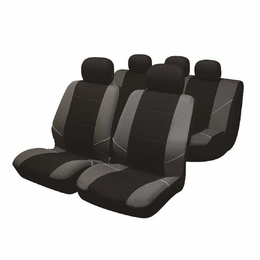 Merton seat covers black with grey pattern inc head rest, side airbag compatible, full set front and rear with 5 headrest covers, fits all cars, machine washable.